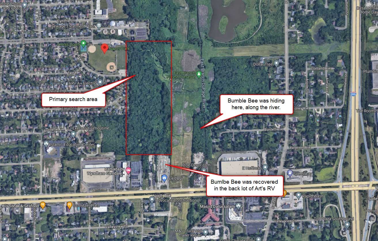 They gathered at 10am making their way through the dense forest they had been through the days before. As you can see in the image, the primary search area was the forest preserve that bordered Nazos Park. This time though, they expanded out into areas they had not been before. Jackson, the son of a long-time As Good as Gold member, was walking through 5-6' tall grass calling her name. Being a retired breeder dog, she did not know her name and was terrified of people. He came within 3 feet of her hiding in the long grass. He only saw her once she got spooked and took off running,
