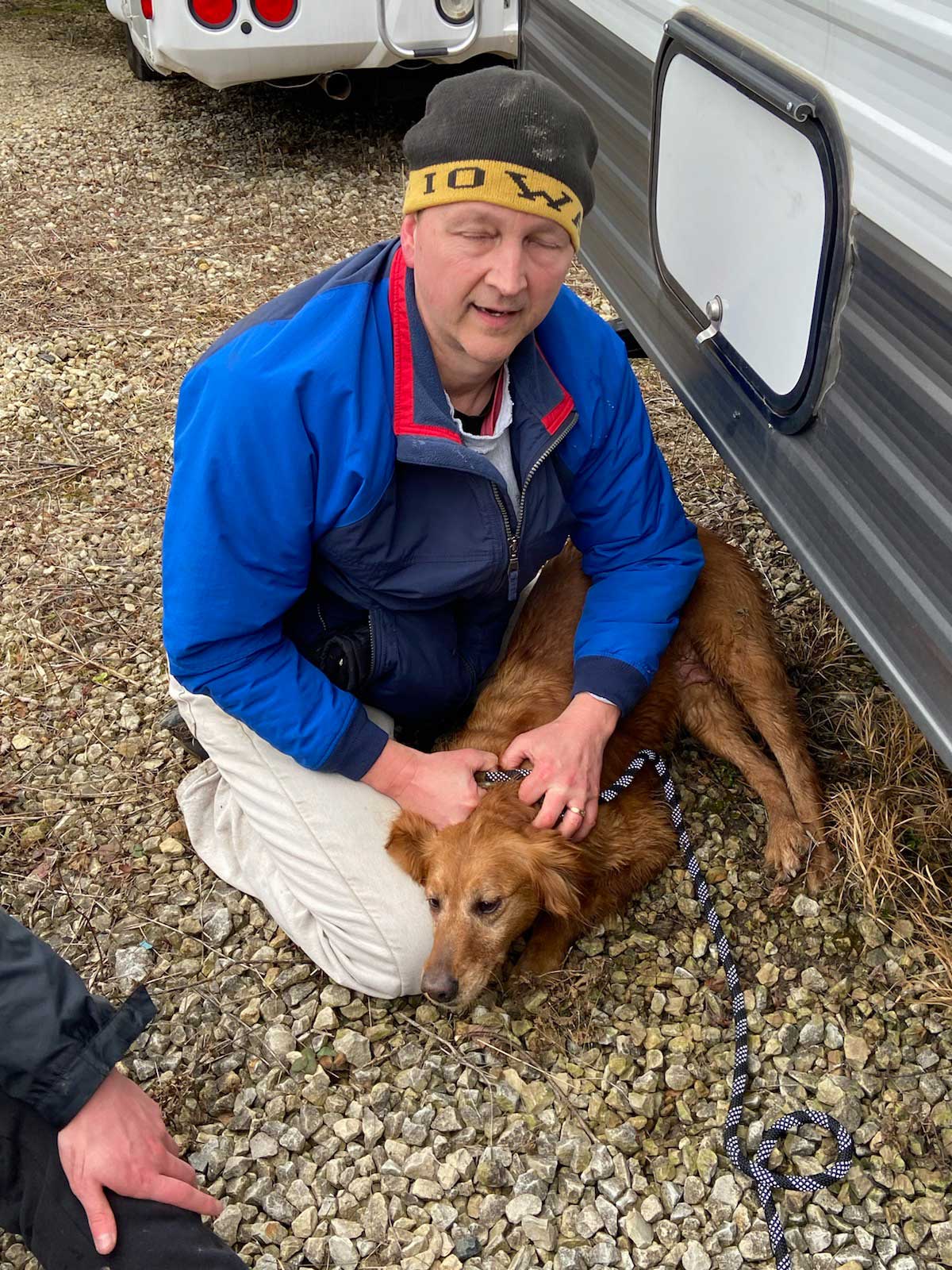 Bee is captured by JimFour staff members went outside, closed the gates and asked what they could do to help catch Bumble Bee. Nickey and Elizabeth had arrived from where they we searching. The Art's RV staff said there was a hole in the back fence. Nickey went to take a position there to prevent her escaping again. The Art's RV staff and AGaG volunteers maintained a perimeter around Bumble Bee as she run up and down the rows or RVs and between them. After what seems like 30 minutes but was probably 10, Bumblee dove under an RV. All of the volunteers surrounded the RV while Jim crawled under to secure her. She was safely pulled out from under the RV and two collars and leashes were placed on her.